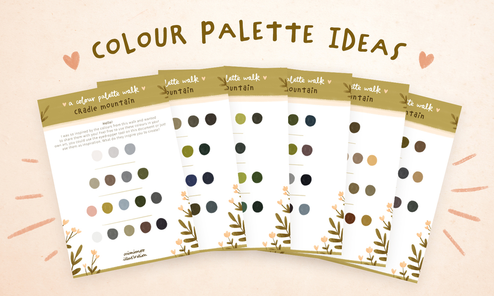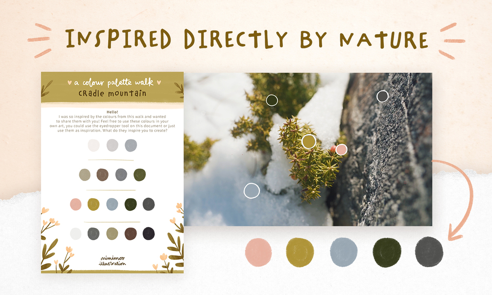 24 colour palette ideas taken straight from nature! These palettes are part of my YouTube video where I take inspiration from a snowy mountain walk in Tasmania to create some simple and sometimes unexpected palettes.